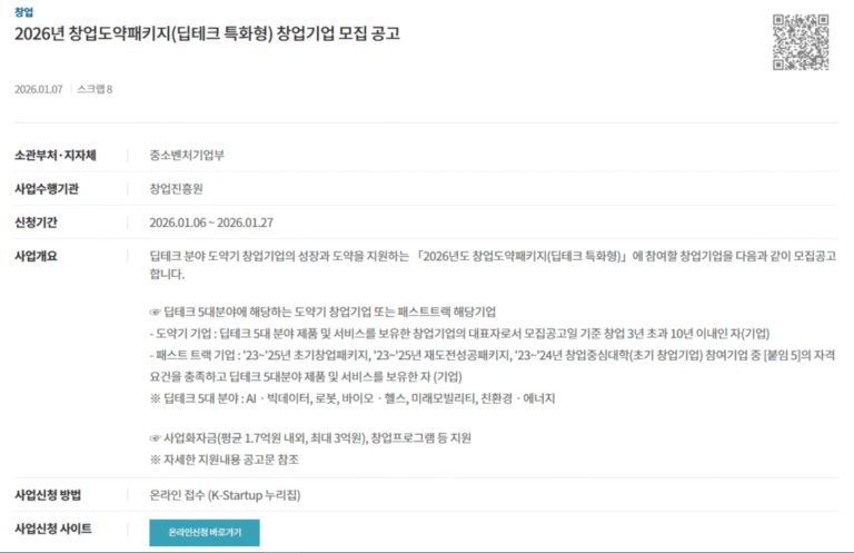 창업도약패키지 딥테크 특화형은 업력 3년 초과~10년 이내 기업을 대상으로 최대 3억 원 사업화 자금을 지원하는 고액 프로그램입니다. 빅테크, AI, 로봇, 바이오헬스, 미래모빌리티, 친환경에너지 등 5대 딥테크 분야를 중점 모집하며 평균 지원금 1억 7천만 원 수준입니다. 일반형(1월 말 모집, 최대 2억 원), 투자연계형(5월 모집)과 함께 운영되지만 딥테크는 업력 제한이 넓고 기술 중심 기업에 최적화되어 있습니다. 중복 신청 가능하니 여러 트랙 도전하세요. 지방우대지역 자부담 완화 혜택도 큽니다.