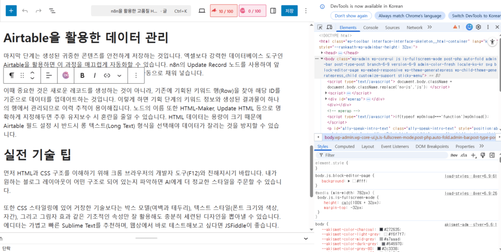 마지막 단계는 생성된 귀중한 콘텐츠를 안전하게 저장하는 것입니다. 엑셀보다 강력한 데이터베이스 도구인 Airtable을 활용하면 이 과정을 매끄럽게 자동화할 수 있습니다. n8n의 Update Record 노드를 사용하여 앞서 기획해 둔 키워드 레코드에 생성된 HTML 코드를 자동으로 채워 넣습니다.